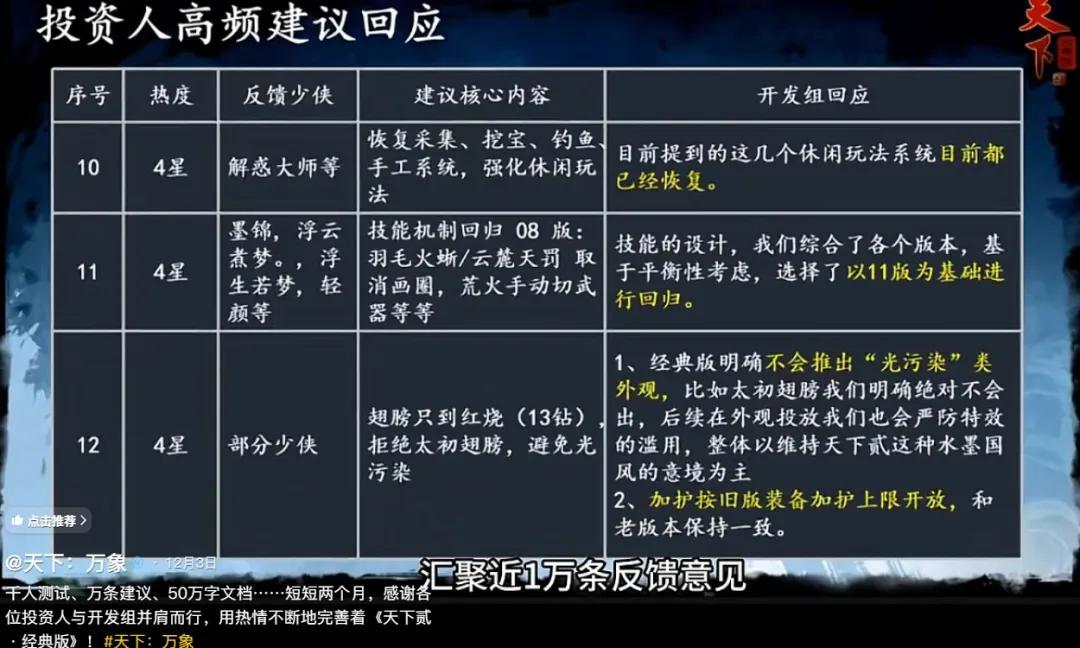 因爲經過多年的篩選,如今依舊能堅持遊戲的羣體,大多都對遊戲有更爲特殊的感情,他們也許會對遊戲有意見甚至不滿,但相較於“棄坑”,更希望的其實是能讓遊戲逐漸變好,年齡的增長也讓他們基本給出過於情緒化或者不合理的建議——這也讓這種在其他遊戲裏不太現實的玩家反饋模式,在《天下》這樣的遊戲中得以實現。