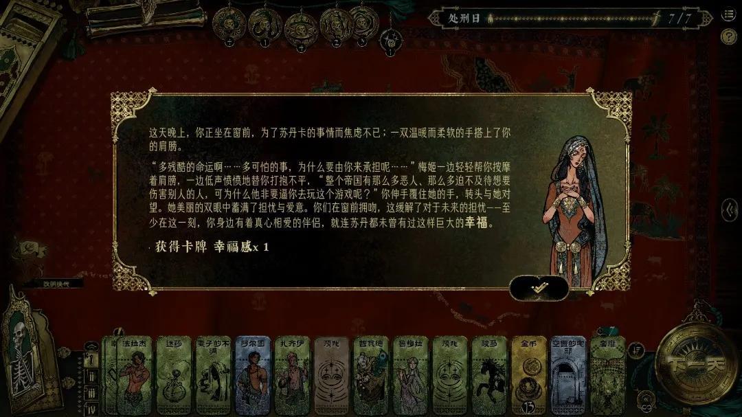 在開始,遊戲通過教程關的小故事設置了簡單的目標:折卡,活下去。而在初期,很多人內心的目標大概是做個好的活人。這個階段能靠自己摸索打出來的結局,除了在折完所有卡牌後陷入輪迴,便是帶着老婆逃亡。