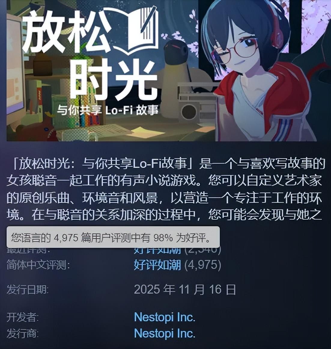如今來看,《放鬆時光》的設定打動了很多玩家。發售不到兩週,遊戲的銷量就突破十萬份,Steam上的評價總數超過七千條,好評率一度高達99% ,是少見的幾乎滿分評價。