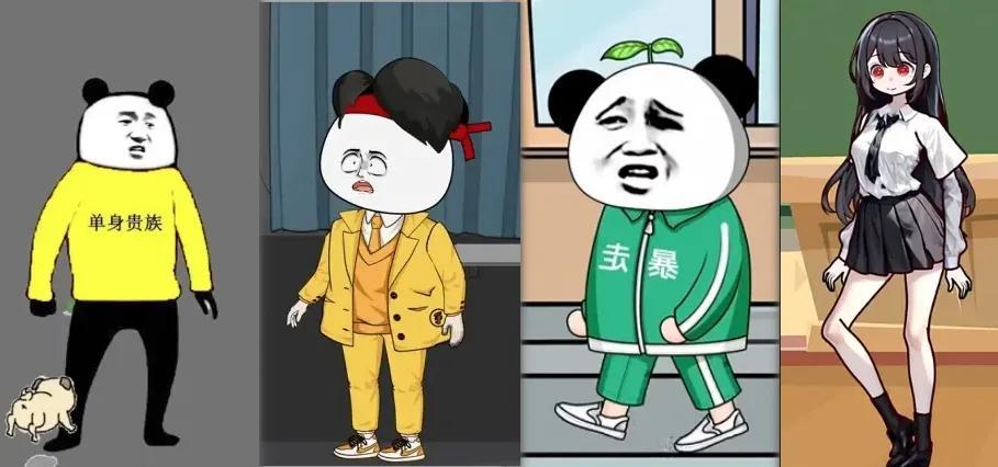 它的形式相當簡陋,大部分情況下,就是給一個熊貓頭表情包配上身體,通過熊貓頭表情包的變化、簡單的人物動作和AI獨白,站樁演繹些簡單的劇情。