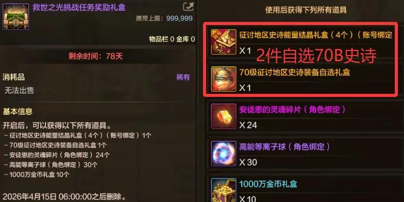 這裏4個史詩能量結晶可以自選1件70B自選史詩,再加上70B自選史詩禮盒,所以保底有2件自選70B史詩!
