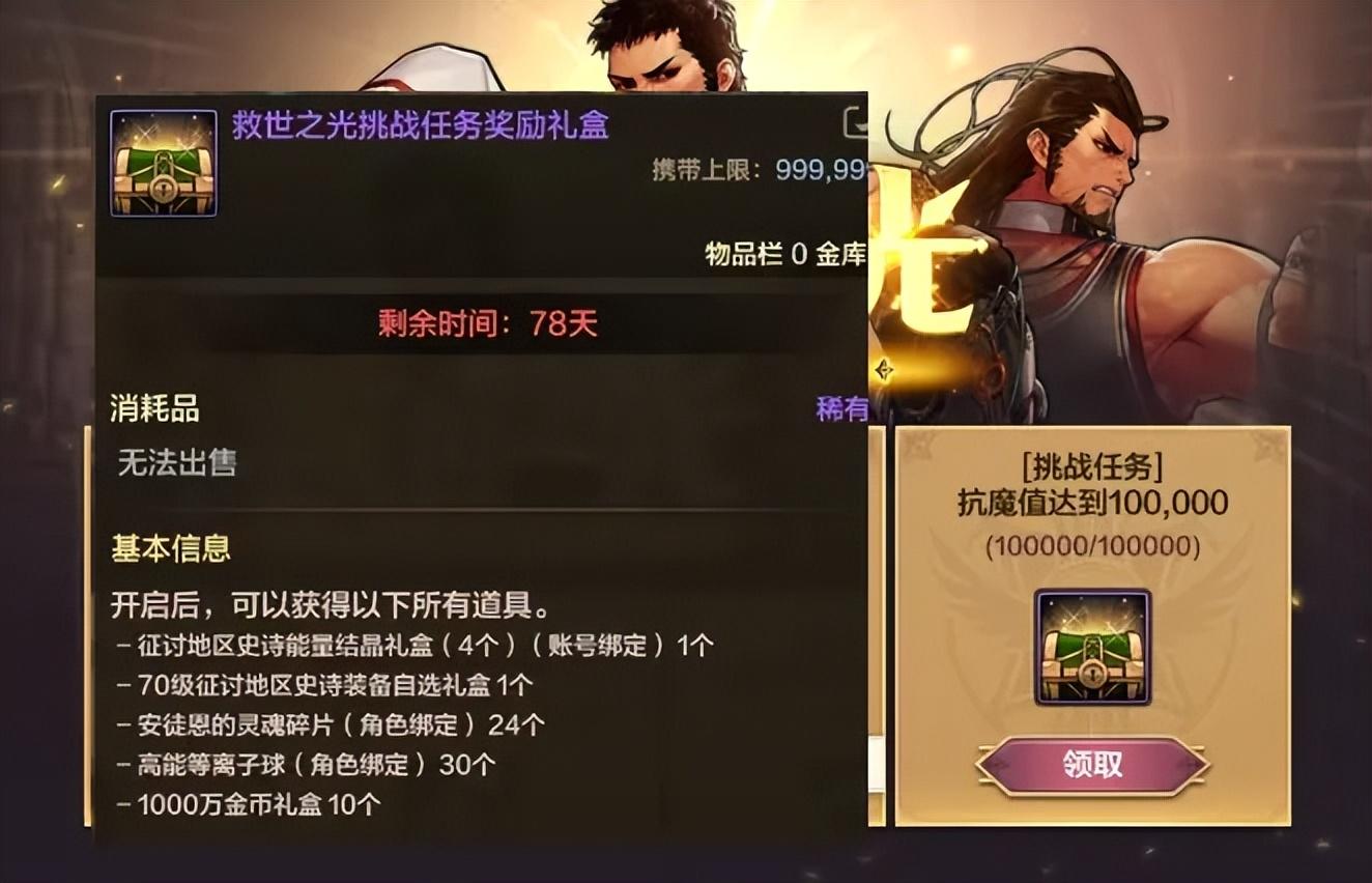 「挑戰任務10萬抗魔值」24個紅豆、4個史詩能量結晶、70B自選史詩、1億金幣等