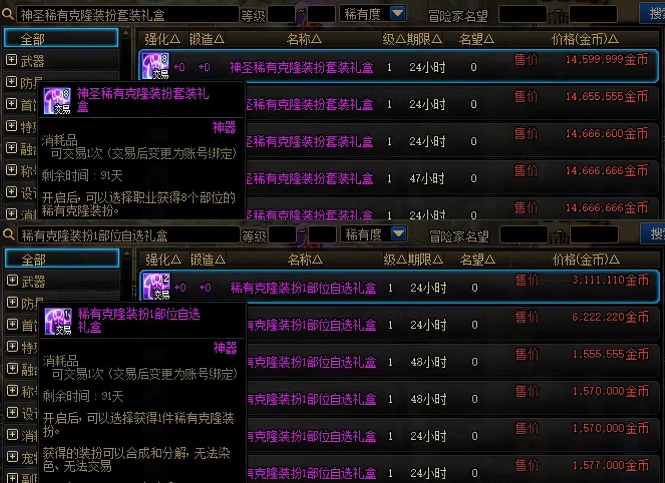 如果你單獨搜索單個職業的隱藏時裝,比如“男鬼劍禮盒”“女鬼劍禮盒”,那麼售價普遍在1700~2000萬之間。
