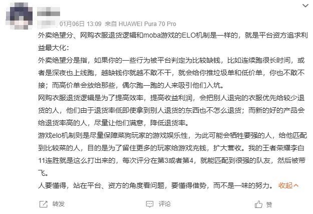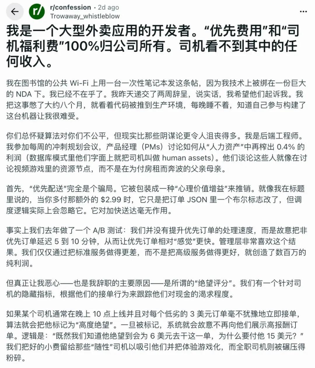 全帖清晰地描繪出了大公司構建起的一套剝削外送員、欺騙顧客的系統,例如,如果顧客常給出慷慨的小費,系統就會壓低騎手的基礎運費,公司就能少發薪水。
