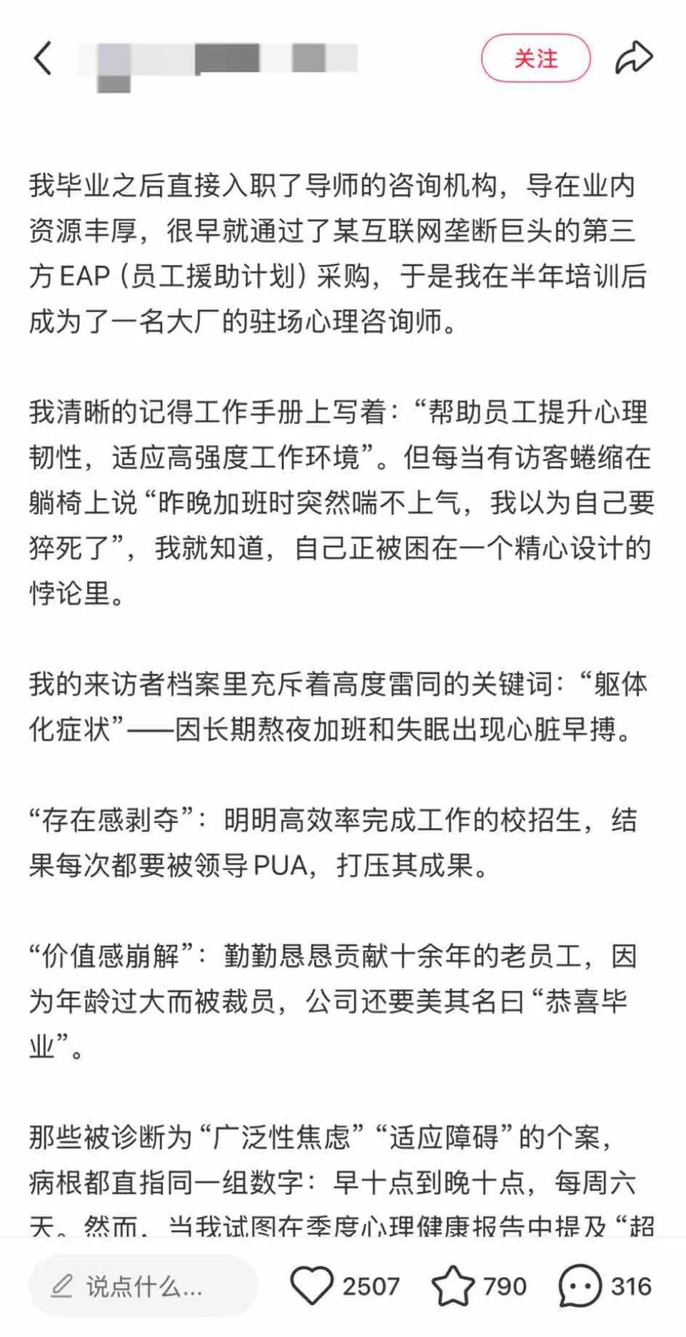 在上一份工作中,我參與過一篇關於大廠駐廠心理諮詢師的稿件,線索源自一條網上正流傳甚廣的爆料帖。