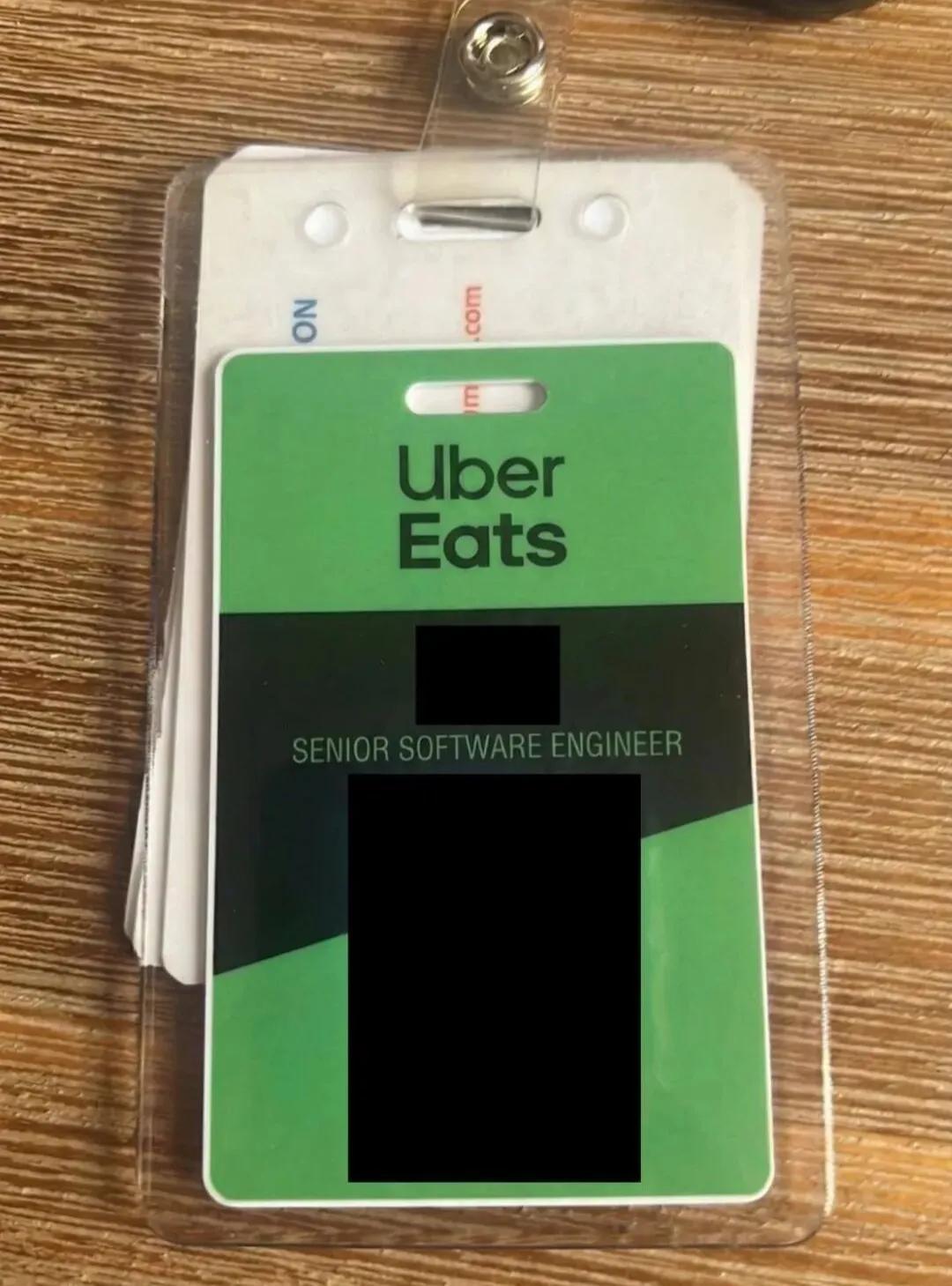 工牌上所寫的職位爲高級軟件工程師,照片中起了一層毛邊的桌子和略有污漬的塑料殼,都增強了真實感