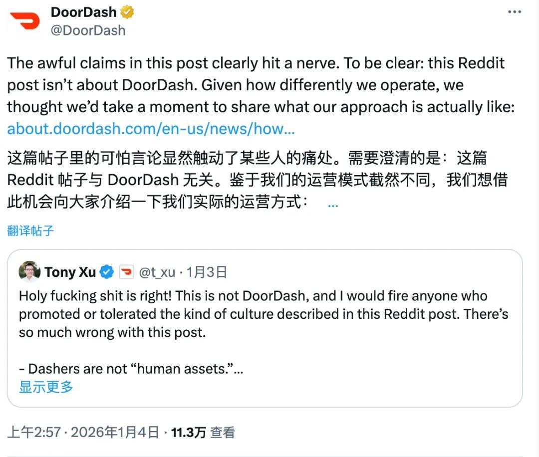 但輿論依然洶湧,Doordash的官方賬號不得不在凌晨三點再次發文澄清。