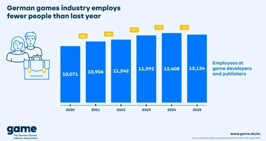 其實對德國遊戲行業來說,2025年確實不怎麼好過,產業規模在持續四年的增長後經歷了首次下滑,相關企業數下降了4%,員工人數則下降了2%。德國遊戲產業協會將其歸因爲國際整合浪潮,以及德國遊戲行業資金的不確定性——不過這些因素也在一定程度上穩定了整個行業。