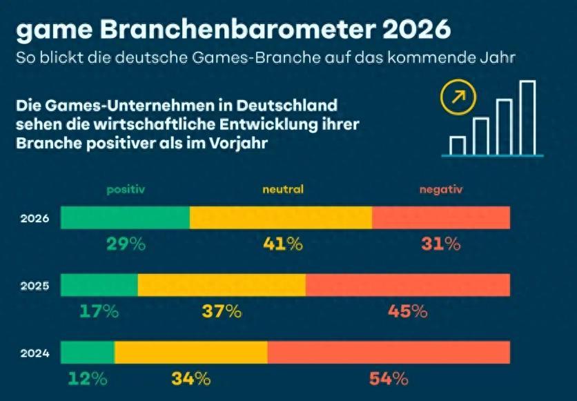 據德國電子遊戲行業協會出具的《2025產業年度報告》顯示,超過半數的德國遊戲公司都預計2026年的業務運營將出現積極增長。29%的公司則認爲情況會比上一年更好——這個數字幾乎是2025年的兩倍。