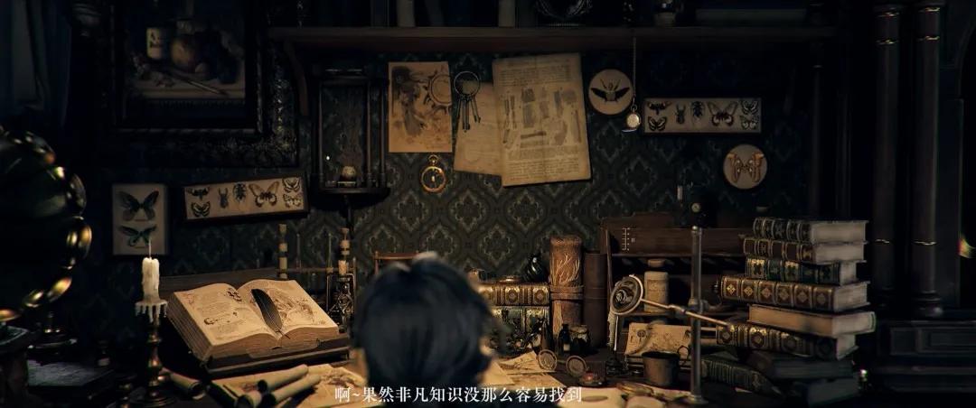 前半部分節奏輕快、陽光明亮。開場是主角的房間,歐式古典風格,蝴蝶標本、書頁筆記被隨意地釘在牆上,巨大的書桌上能看到蠟燭、羽毛筆、羊皮卷、四處堆放的書籍,神祕學氣氛濃郁。