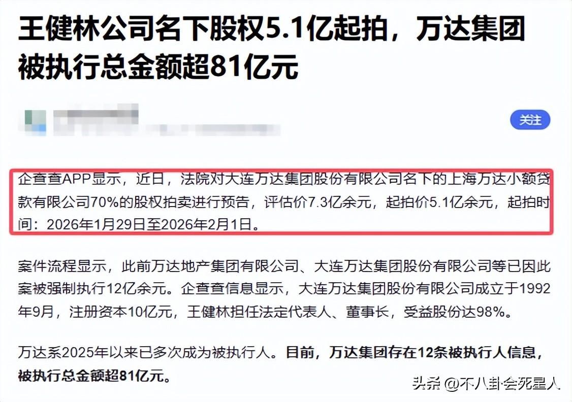 法院剛剛對萬達集團名下的上海萬達小額貸款有限公司70%的股權進行了拍賣預告,預估價值是7.3億元,起拍價5.1億元,起拍時間從2026年1月29日至2026年2月1日。