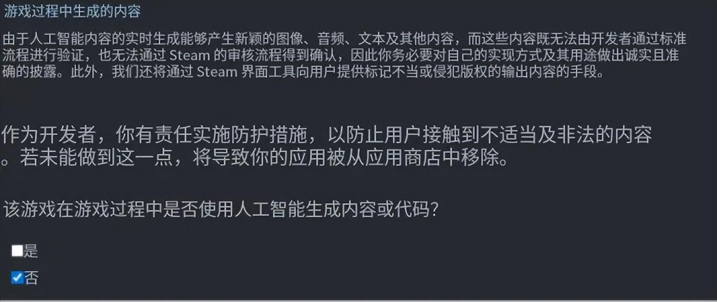 在2024年,Valve首次發佈AI政策,要求開發者在提交遊戲時,必須在調查表格里如實申報遊戲的AI使用情況、撰寫對應的說明——這段文字最終將出現在商店頁面上,向玩家展示。