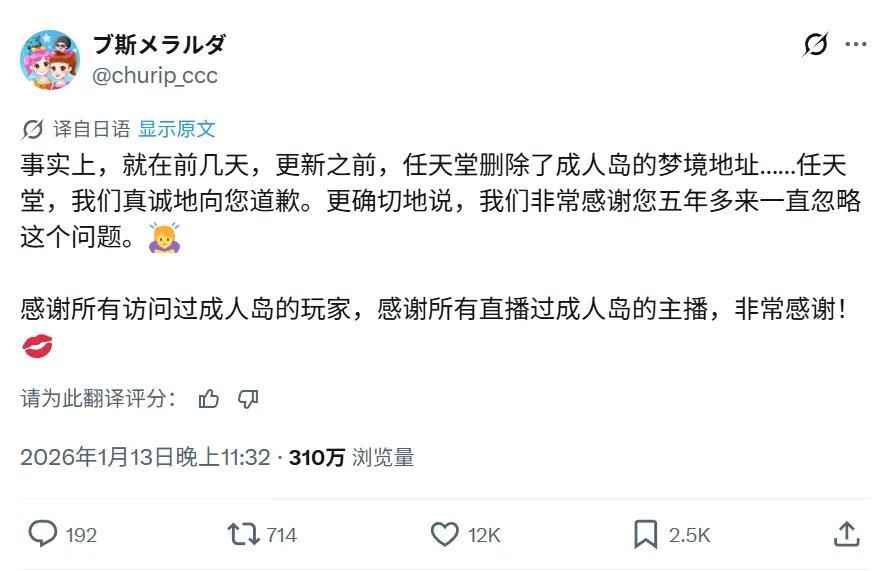早在2020年《動森》發售初期,“成人島”的雛形就已經出現,之後五年裏Churip的“成人展覽”越做越大,之後任天堂推出夢境功能後,參觀島嶼的門檻也降低不少,“成人島”的知名度跟着水漲船高,考慮到任天堂對成人內容的敏感性,“成人島”直到現在才被處理也實屬不易。