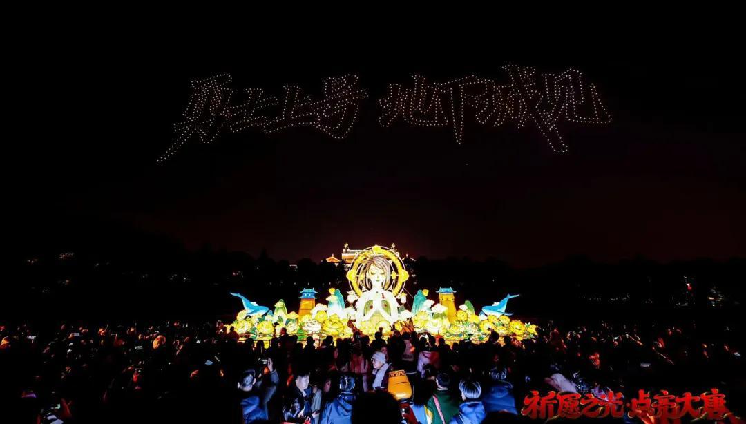 但即使不是遊戲的直接受衆,現場的市民遊客同樣也能被這次活動所營造出的特殊氛圍所打動。當夜幕降臨時,場邊35米長的巨型賽麗亞花燈準時亮起,上空1000架無人機不斷變換,交替擺出天帷巨獸、時空之門等遊戲元素符號,更組成“勇士上號 地下城見”字樣,將全場氣氛帶至高潮,所有人都不約而同舉起手機,記錄下這一幕: