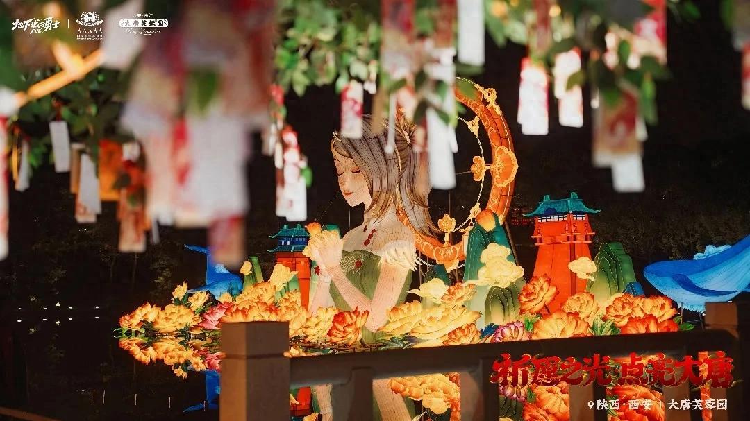 1月17日,西安大唐芙蓉園的曲江池畔立起了一座長達35米的賽麗亞巨型花燈,到場的玩家把自己的新年祝福籤綁在河燈上,順流漂送而下,在一衆仿唐建築羣跟前拍照留念,和諸多遊戲NPC們一起許下了新年的願望……
