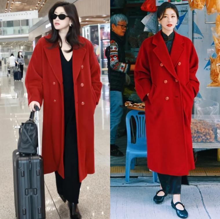 “紅+黑”堪稱王炸配色,紅色的鮮豔張揚,可以利用沉穩的黑色平衡,讓穿搭更加高級。充滿着節日氛圍感的紅色大衣,就很適合搭配小黑裙,裙襬長於衣襬,更有層次感,搭配平底鞋也不壓身高。