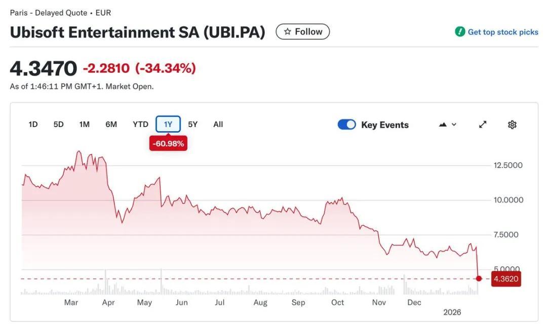 1月22日,歐洲股市開盤後,育碧股價跳水,一度暴跌超34%,創下公司自1996年上市以來最大單日跌幅。