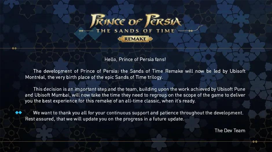 令所有人意想不到的是,這次延期最終成爲《時之砂RE》多舛命途的開端。遊戲在正式宣發後的2年內連續跳票數次,直到2022年,印度工作室的開發權最終被轉交給育碧蒙特利爾,育碧稱將“重新調整遊戲的規模”。