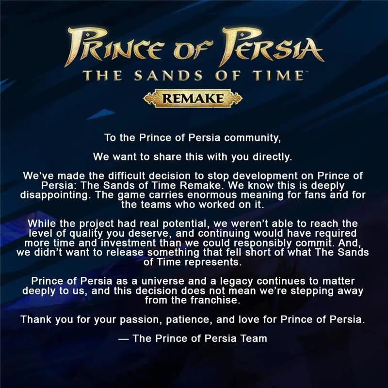 1月22日,《波斯王子》官方賬號發佈正式通告,確認《波斯王子:時之砂 重製版》(以下簡稱《時之砂RE》)項目的開發工作已經停止。