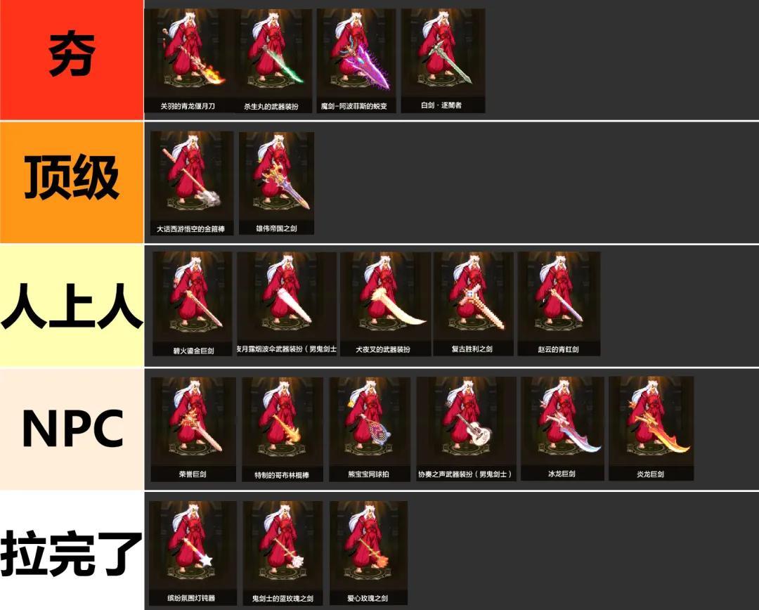 以上就是現版本鬼劍士最熱門的20把武器了,想要全部湊齊應該還是挺難的,不過普通玩家只要能拿到4把T0武器其中一把,基本上就算老資格了!