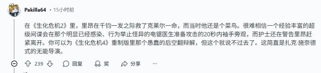 令玩家無法接受的是,這樣一場屠殺面前,里昂的行爲堪稱是“麻木不仁的見死不救”。從喪屍出現到拉響電鋸攻擊,整個過程持續了接近20秒,但里昂則是“冷眼旁觀”,既沒有第一時間動手,也沒有對NPC施以援手,甚至連一句口頭警告都沒喊,只是任由NPC死在眼前,後面還跟着講起了冷笑話。