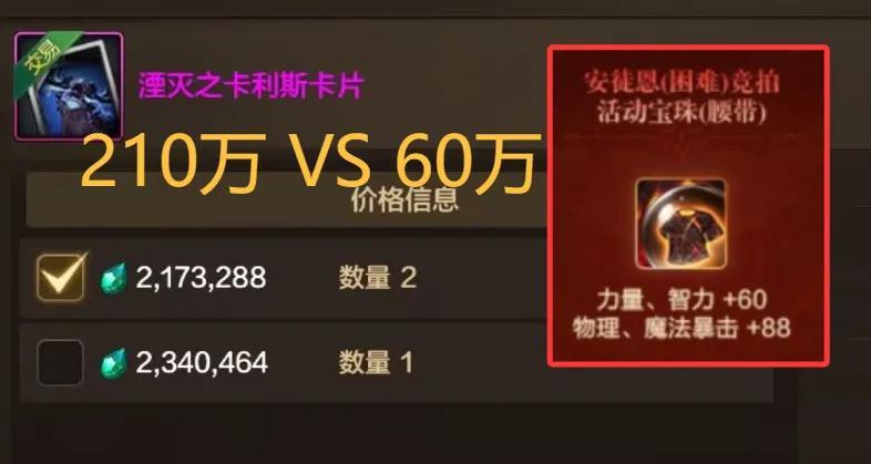“活動腰帶寶珠”60萬,而拍賣行“土龍卡”需要210萬泰拉,相當於就3折入手了,還算勉強能夠接受啦!