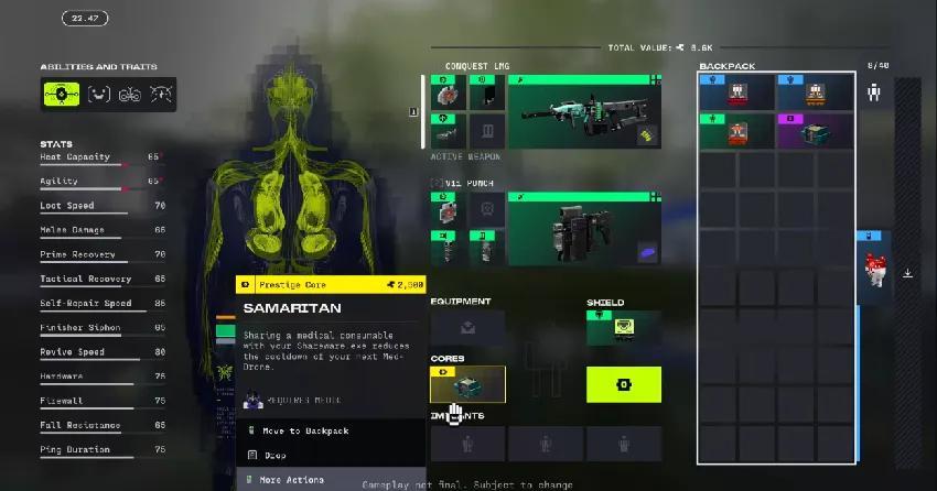 在《馬拉松》,你能搜刮到的很大一部分高級戰利品,就是含有詞條的裝備。包括“植入物”與“核心”欄位的裝備都有詞條,就連槍械也能安裝帶詞條的配件。同時,玩家在遊戲中扮演“疾行者”,操縱一具死亡後自動上傳記憶的外殼,不同型號的外殼擁有不同的技能,要跟裝備詞條搭配,形成用途各異的構築。