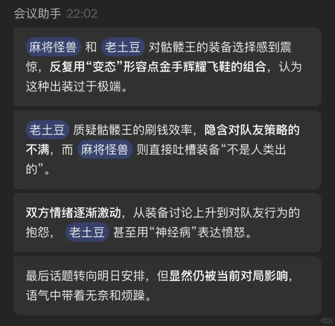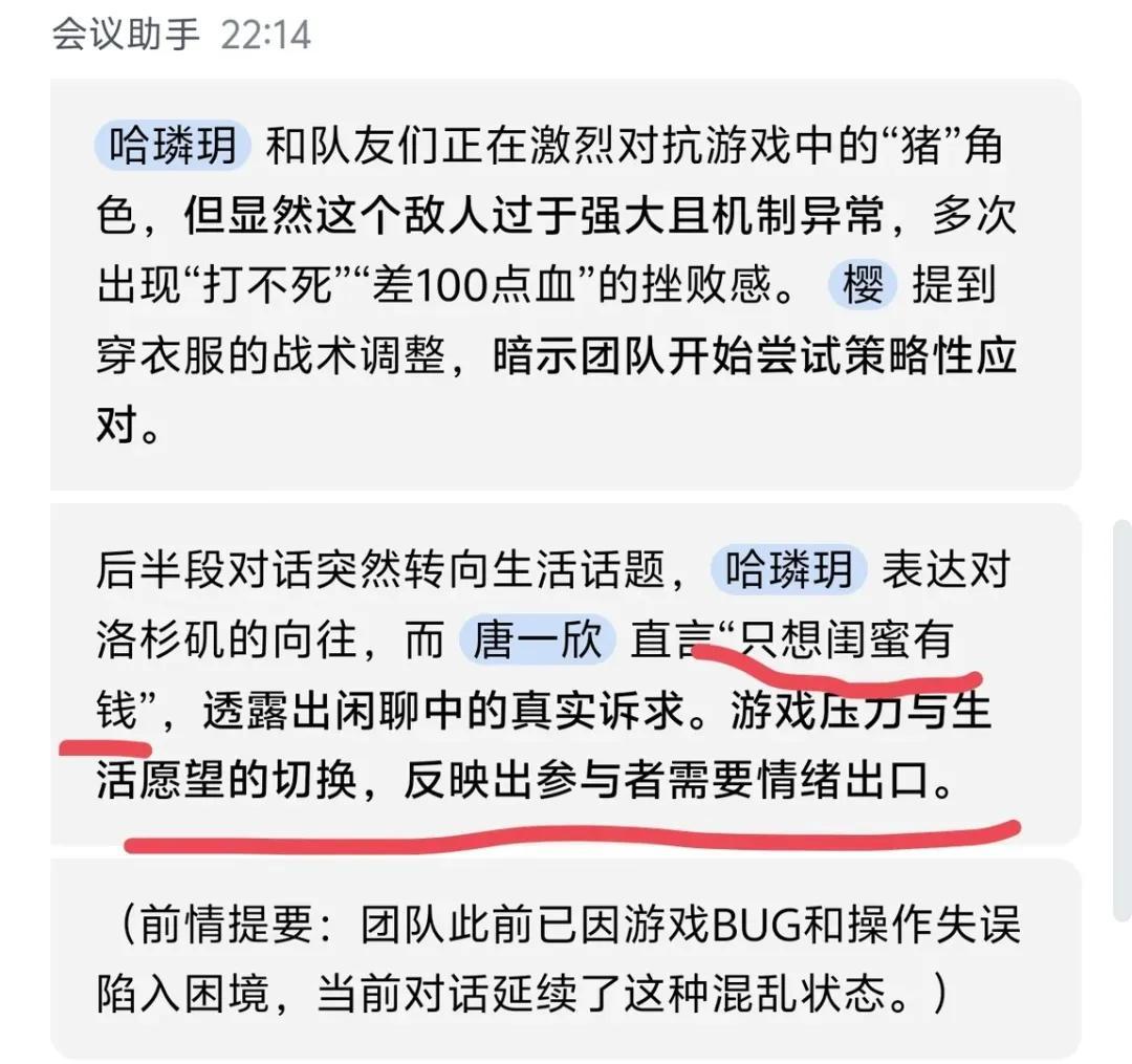 而在遊戲開黑中接入“元寶紀要”,你會看到它艱難地理解開黑過程中玩家隨口的胡話,梳理毫無邏輯的即興發言,還要強崩着給個正兒八經的結論。