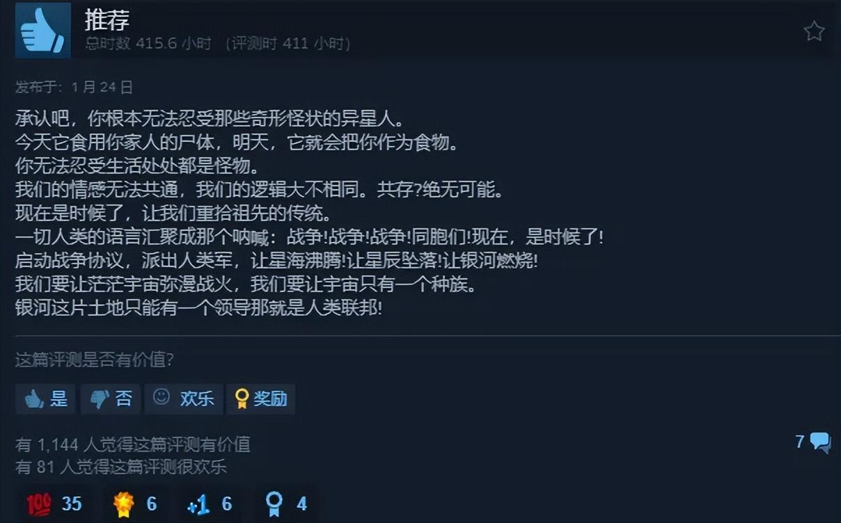 但在Steam評論區刷屏“讓銀河燃燒”的玩家們,不會也不需要在意這些。因爲就像查理本身的立場其實無所謂,《羣星》本身的機制設定也沒那麼重要,“人聯”就只是一件趁手的武器,幫助玩家進行極端的、同樣簡單粗暴的回擊。
