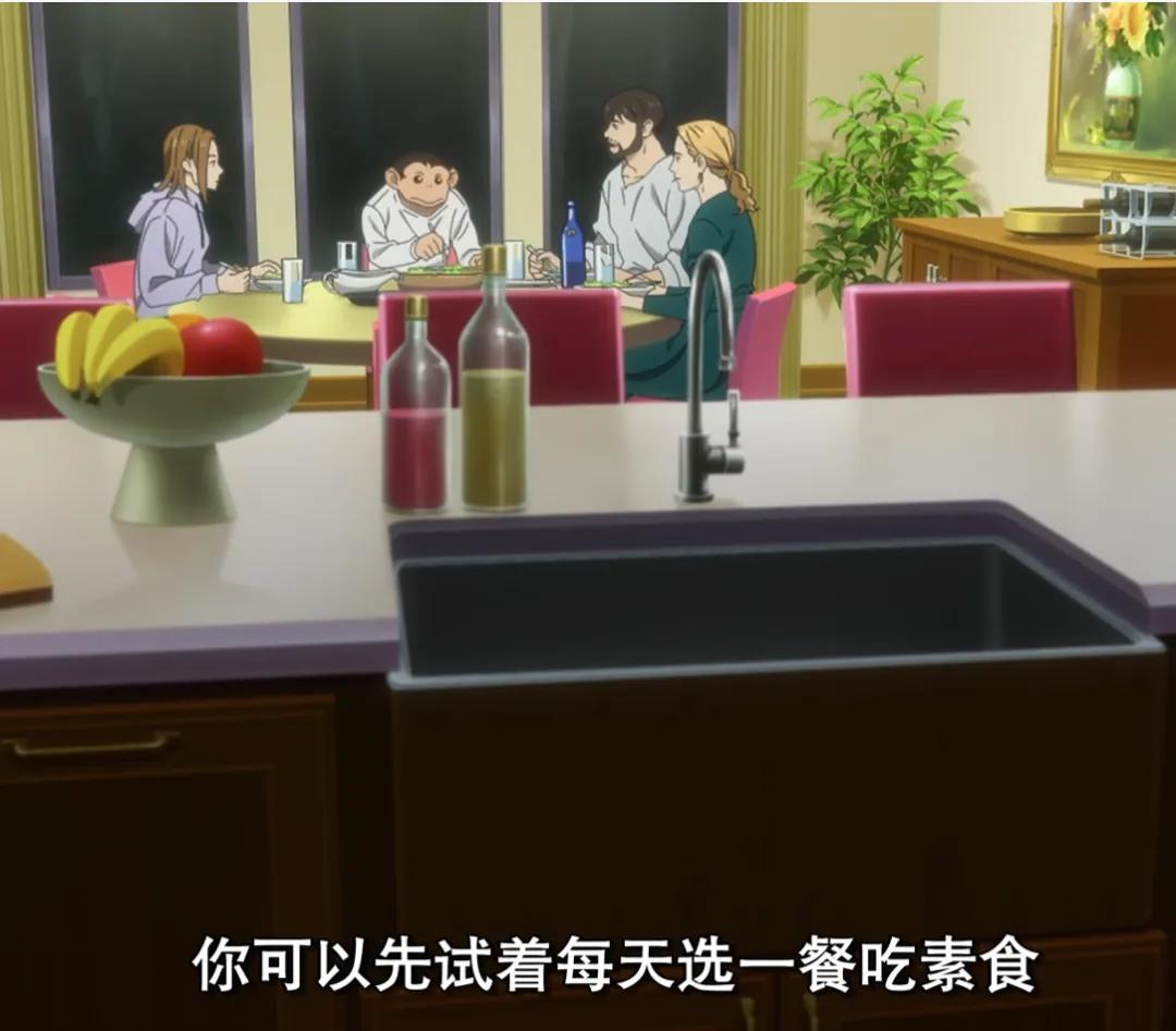《達變》動畫第三集有一段劇情是女主來查理家做客,談起了喫素的問題,查理的養父母堅決與極端素食主義割席,談吐之間盡顯風度,只建議女主角先試試每週喫一次素,再自己決定什麼是更好的生活方式。