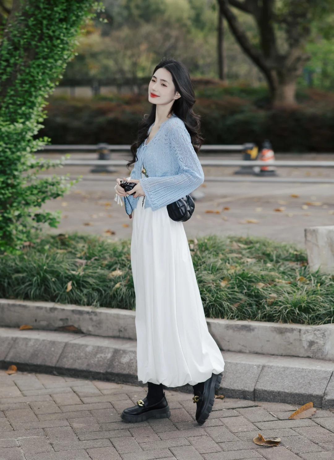 開衫和半身裙的搭配還可以玩轉材質。材質也是穿搭的重要部分,軟糯的針織開衫與飄逸的雪紡就可以做到剛柔並濟、虛實結合,上半身實實在在的毛衣,下面卻步履間裙襬搖曳,自帶浪漫氛圍,復古又浪漫彷彿從老電影裏走出來的女主角。