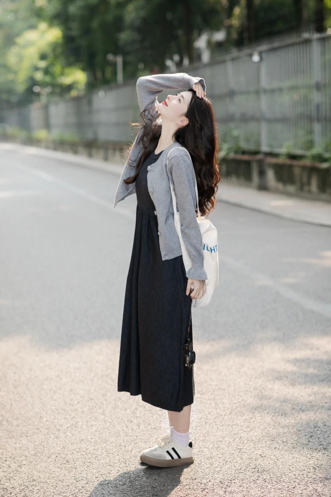 開衫和半身裙的搭配有一個妙點就是腰線,這可是優化身材比例的核心。短款開衫配半身裙的時候,上衣塞進裙子或者乾脆穿稍微收腰點的裙子都能瞬間提高腰線,讓雙腿看上去感覺修長。
