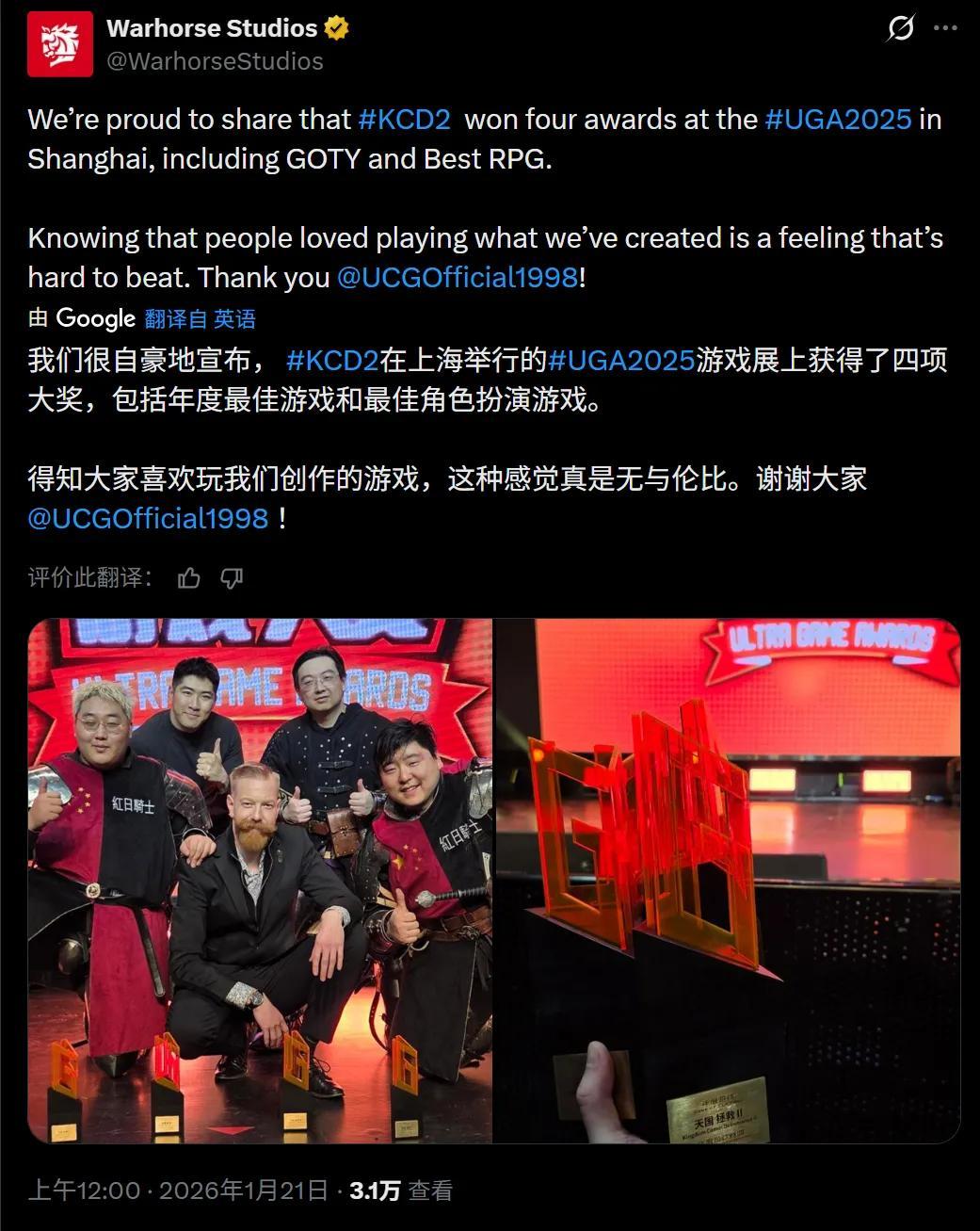 在主要由國內媒體參與評選的“UGA遊戲大賞”上,《天國拯救2》獲得了包括“年度遊戲”在內的四個獎項。開發商戰馬工作室的市場總監來現場領了獎,回去後也把獲獎的消息發在了官方賬號上。