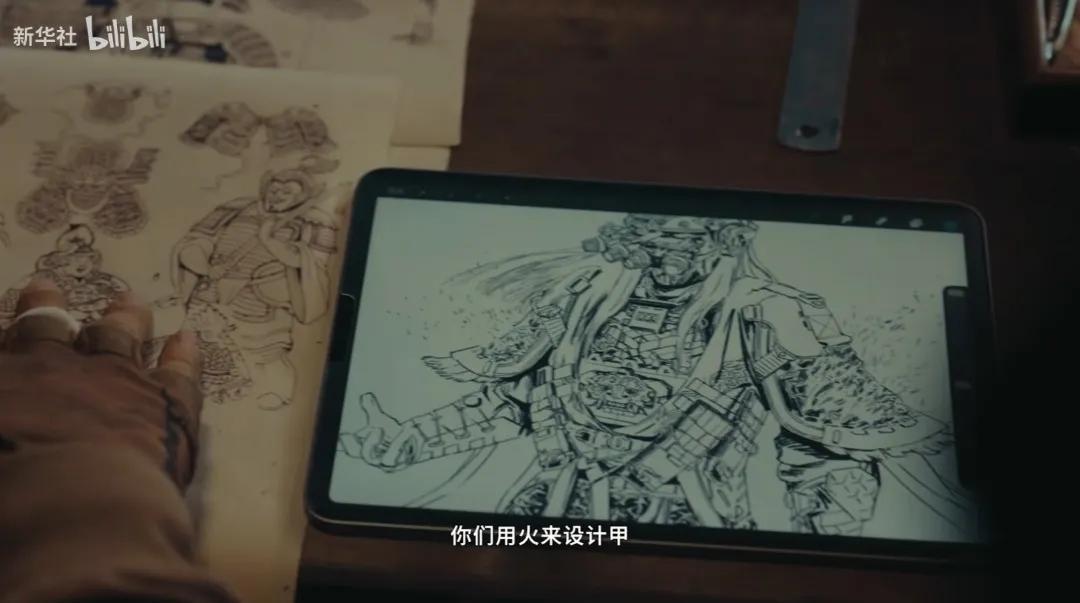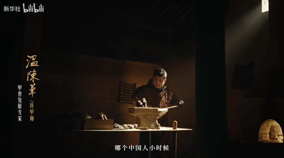 畫面中央出現了一位將軍,一副甲冑。輪廓冷硬、棱角分明,被火光一照,既像從古書中走出來,又像被現代工業重新“加固”過。古樸和鋒利並存,民俗技藝的質感與精密的鏡頭語言攪在一起,反而生出一種很罕見的“科技質感”。