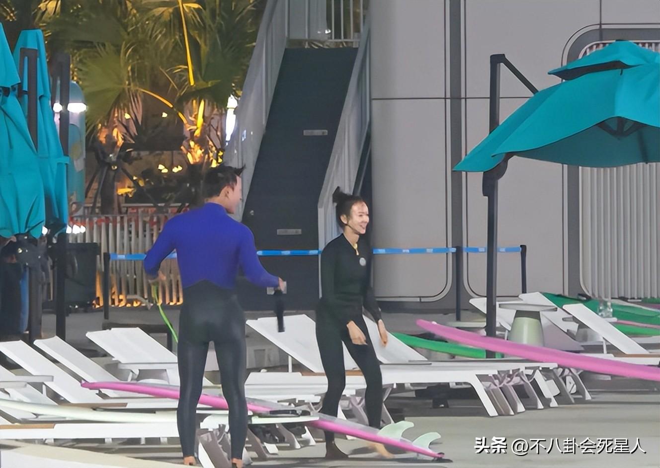 身材依舊纖細單薄,一身黑色衝浪服的吳謹言看上去很開心,她老公洪堯身材魁梧,雖說比例上五五分,有點喫虧,沒有大長腿的既視感,但跟吳謹言站一起也算般配。