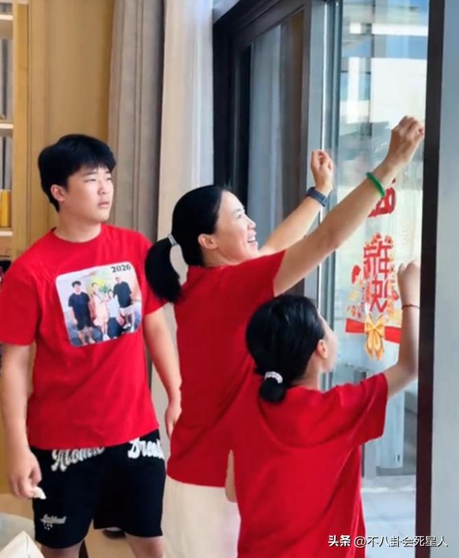 後面,娘三還貼上了福字,值得注意的是,哥哥身上穿的短袖上,還印着一家四口的照片,這個細節就能看出王楠一家是非常和諧有愛的。