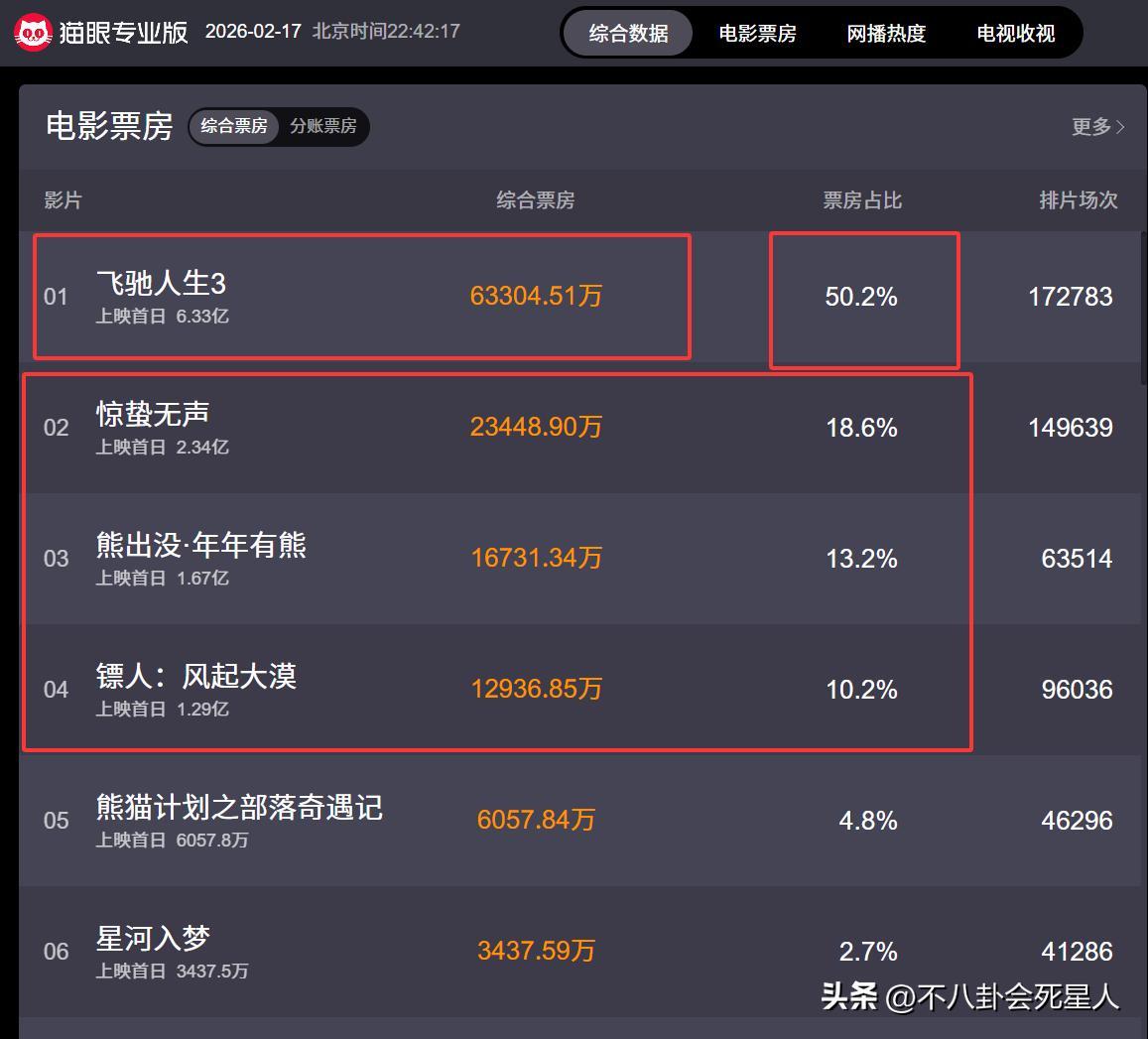剛剛兩天時間,這三部電影已經拉開了差距,《飛馳人生3》斷層領先,以票房佔比50.2%,首日票房破6億遙遙領先其他五部。