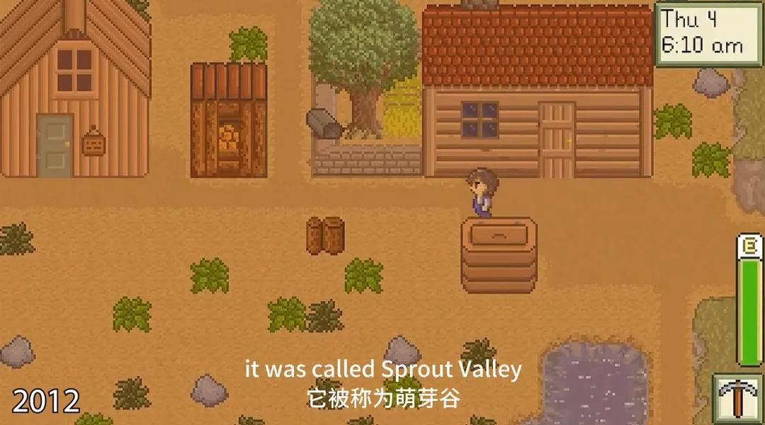 在這支視頻中,展示了星露谷從未公開過的最早期版本(2012年)——當時該項目還被命名爲“萌芽谷”(Sprout Valley),畫面呈現出一種極爲樸素且帶有濃厚早期《牧場物語》風格的像素質感。