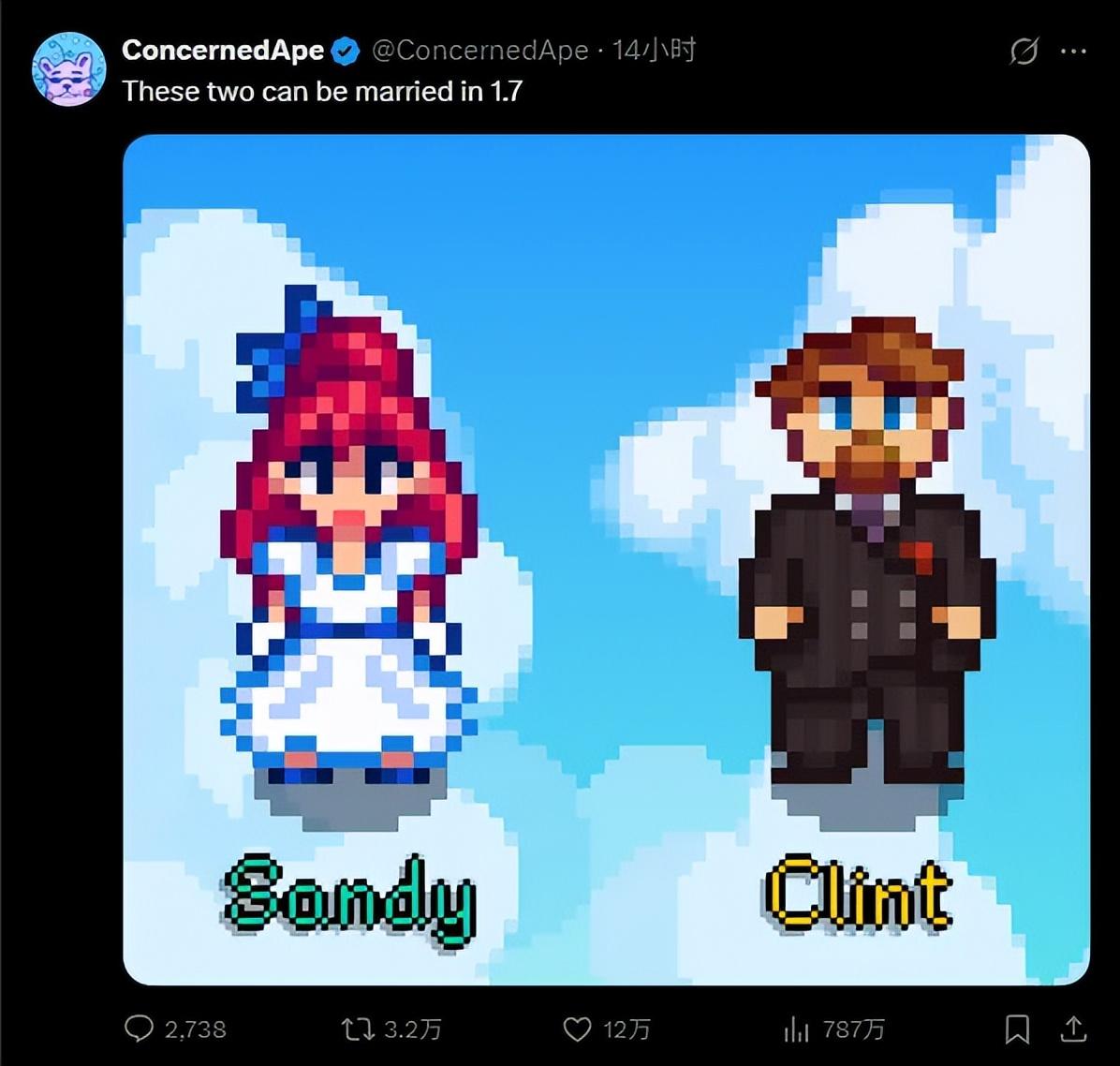 星露谷的發展也從沒停過。像這次隨着十週年宣發的1.7版本,埃裏克在視頻中以一種極具儀式感的方式拆開信封,確認了社區呼籲已久的兩位新婚姻候選人:鐵匠克林特(Clint)和沙漠綠洲商店的經理桑迪(Sandy)。