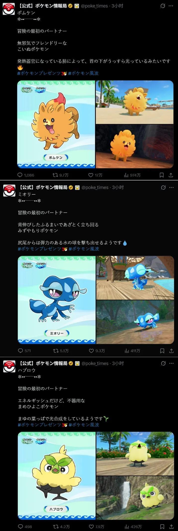 從目前官方推文下的點贊互動來看,至少在日本玩家之間,目前御三家受偏好的排名是博美耿高於妙澪兒高於葉眉鳥。
