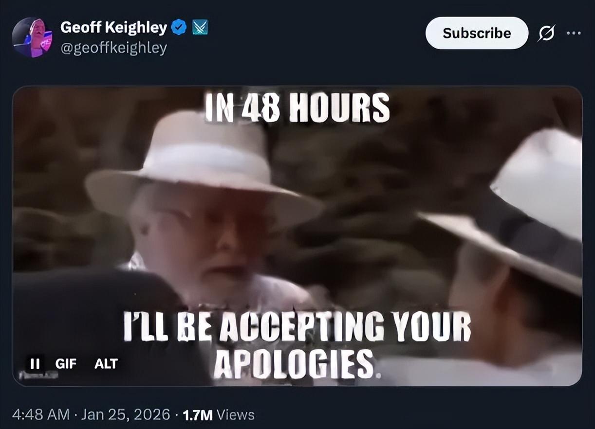 怎麼說呢,至少Geoff確實很喜歡這遊戲,因爲在《Highguard》正式發售的前一天,當社交平臺充斥着對這款遊戲的懷疑時,他本人還專門以梗圖的形式發了一條推文: