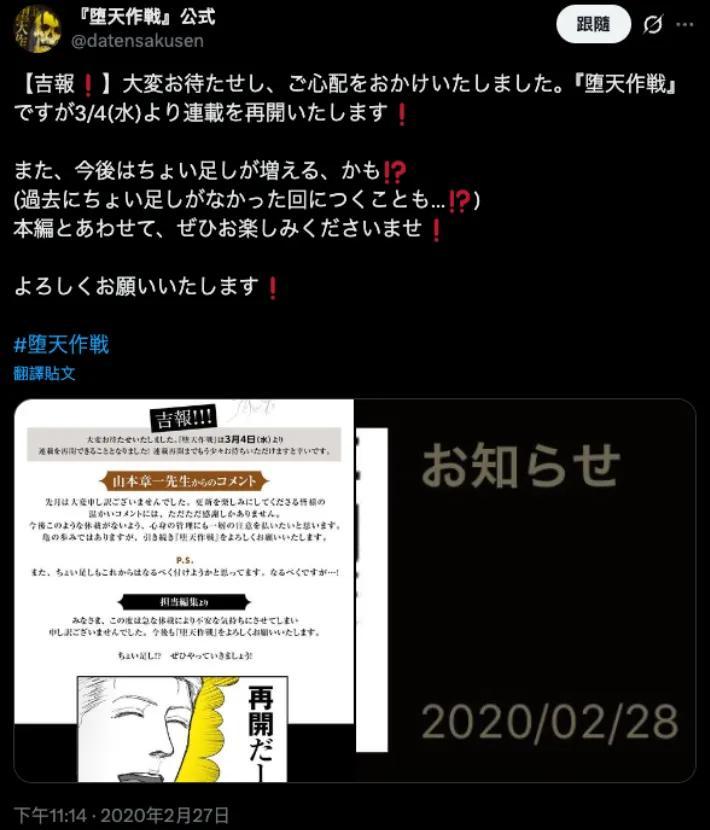 2020年2月27日,《墮天戰紀》宣佈復刊,慄田和明表示“爲了防止再度發生臨時休刊的狀況,我會加強身心健康管理”