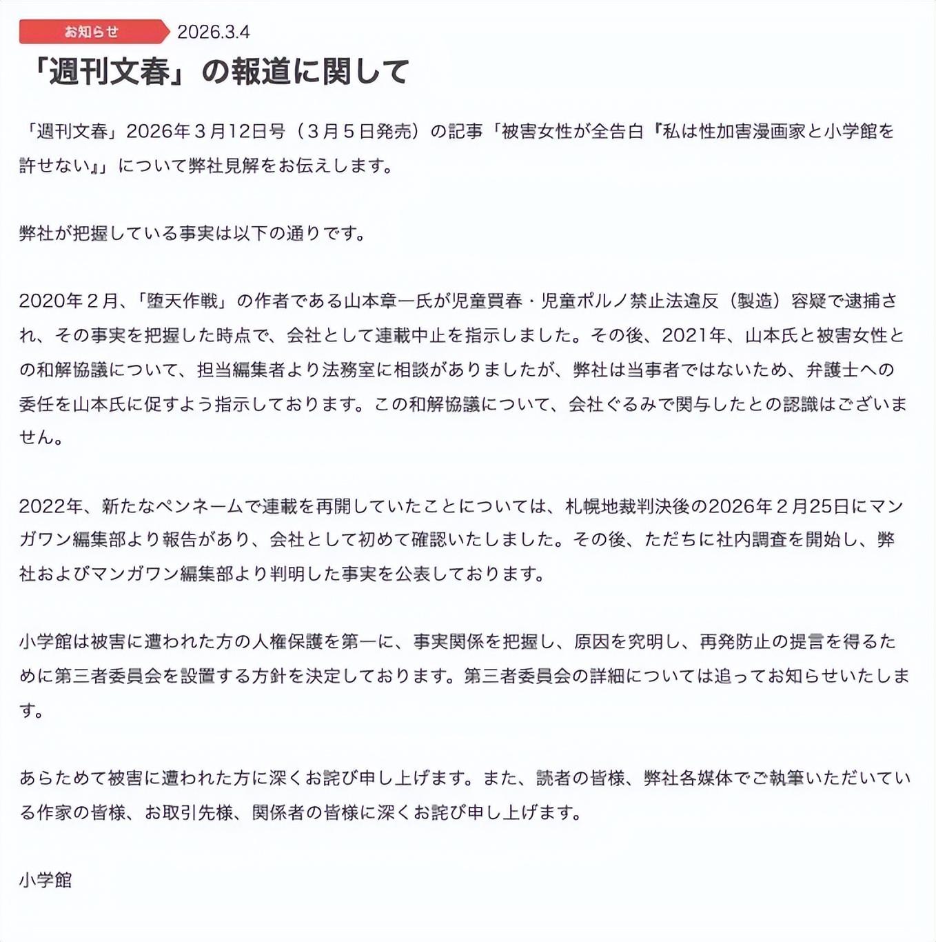 《週刊文春》公開這篇報道的前日深夜,小學館通過MANGA ONE的推特賬號及官方網站,發佈了名爲“關於《週刊文春》報道一事”的公告。