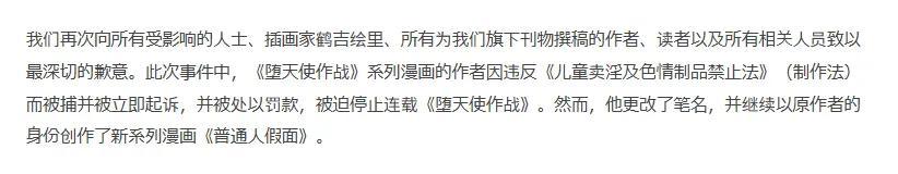 顯然,整篇聲明都試圖將責任限定在漫畫家及相關編輯的個人層面,但這些說法無論如何都難以自洽。像是公告稱曾明確指示《墮天戰紀》停止連載,但卻無法解釋它爲什麼還是連載到了2022年;