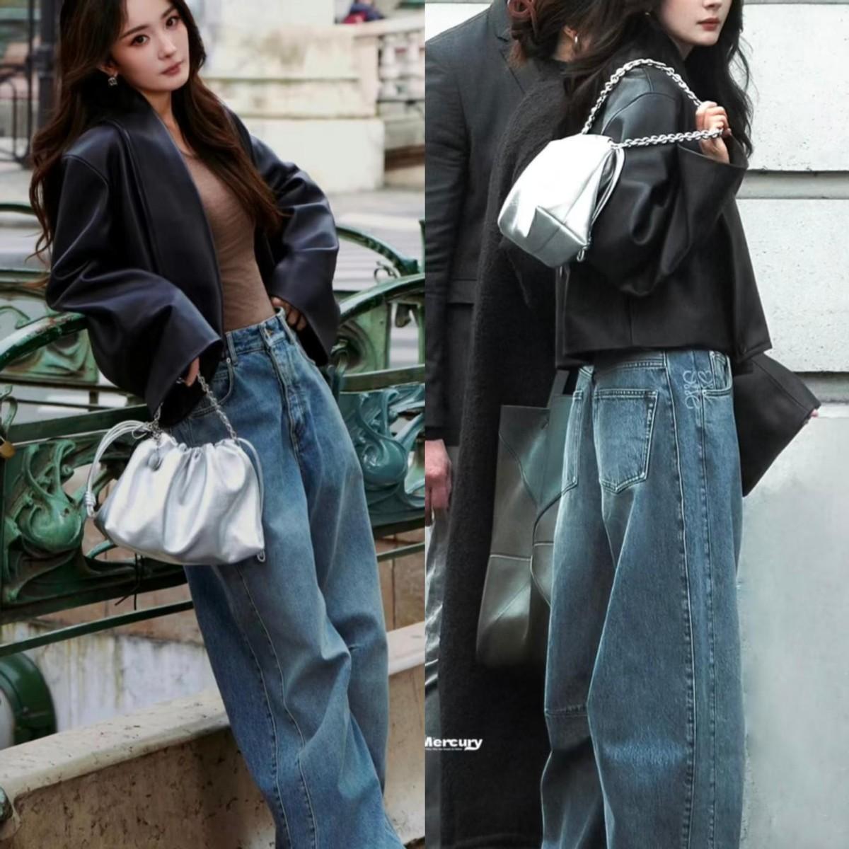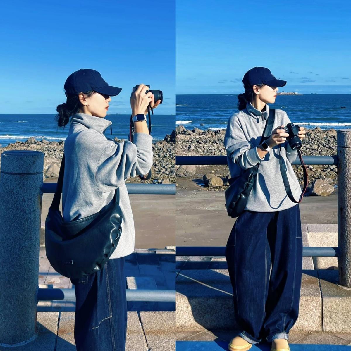 而高飽和度的牛仔藍和淺灰形成經典的冷暖對比,闊腿版型對各種腿型都很友好,卷邊設計露出腳踝,增加了利落感,也避免了下半身過於拖沓。