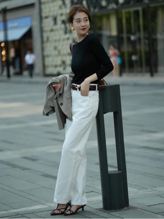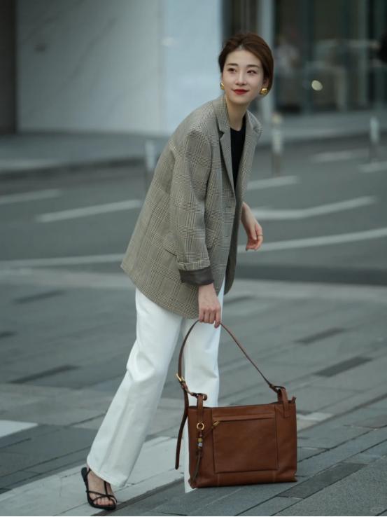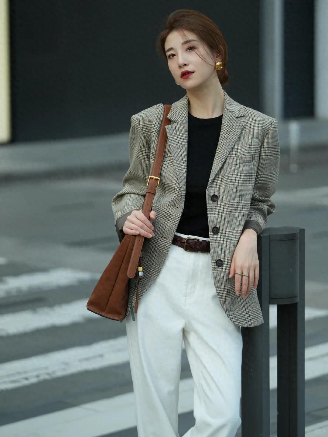 格紋西裝有着職場感,卻不死板反而帶着絲精緻意味。而白色直筒褲提亮效果好,整個人都看起來精神了,格紋又壓的住白色,也不會顯得廉價,也不會顯胖。