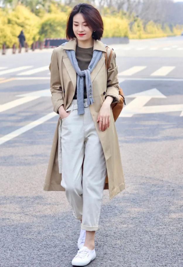 懶人穿搭的天花板就是一雙小白鞋了。小白鞋是中性色,不僅可以適配所有顏色的風衣,而且白色還自帶減齡屬性,讓你看起來有精神,可以說是舒適度和顏值的雙贏!