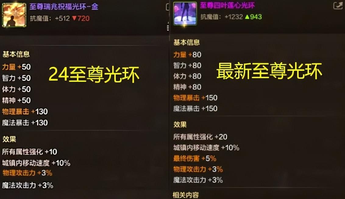 主要提升了暴擊、屬強和最終傷害的加成,最近新春版本送的“神駒光環”,實際上也和24至尊光環屬性一樣。