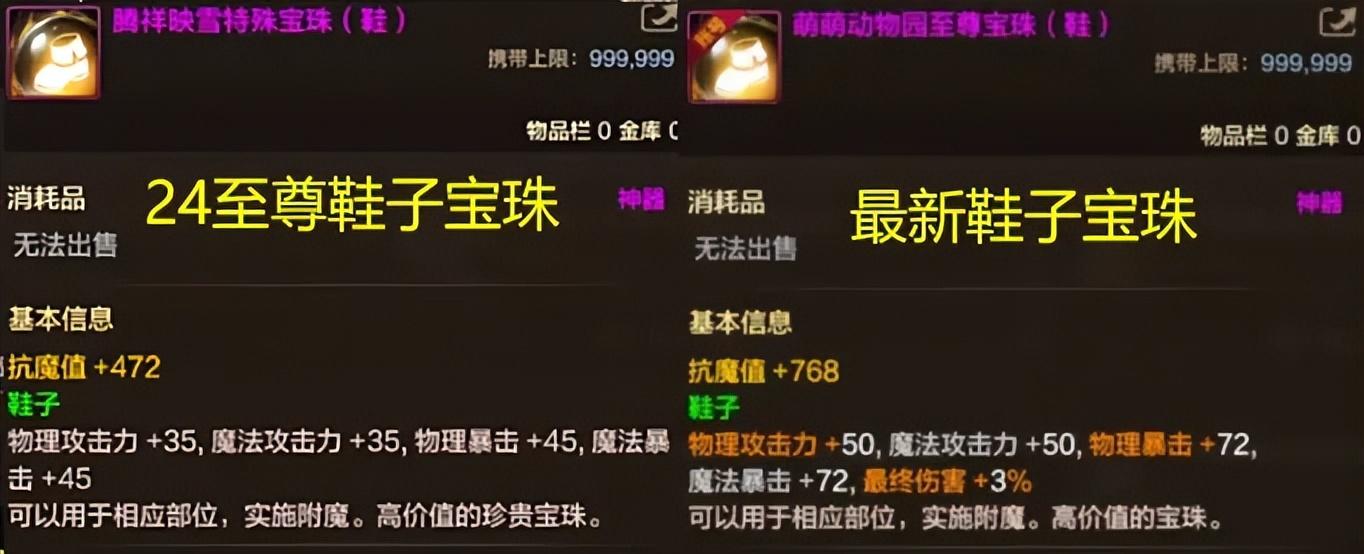 不僅大幅度提升了雙攻暴擊,而且還加入了3%最終傷害,這個差距就特別大了,而且萌萌福袋中也可以換24至尊鞋子寶珠,理論價值也在20萬泰拉左右。