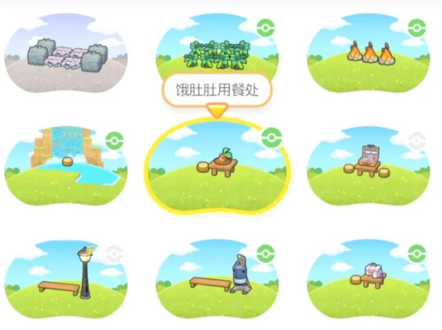 遊戲把每個棲息地的材料數量,都控制在5個左右。四個草叢往那一擺,就有妙蛙種子往裏鑽;四個草叢挪到池塘邊,又成了傑尼龜的棲息地。很多時候,還會把相關道具擺在“三步之內”,撿到一塊沙袋往旁邊的凳子旁一立,又成了快拳郎的棲息地。